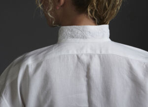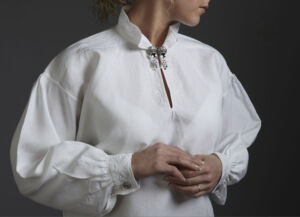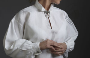 Skjorten er i hvit lin med hvitsømsbroderier på krage, mansjetter og på hver side av halssplitten. Den lukkes med en halssølje og mansjettknapper i sølv.