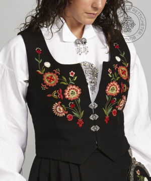 Stakken er i sort, mørkeblått eller mellomblått ullstoff i klede eller toskaft. Den er foldelagt med et glatt parti midt foran, og nederst er det en bred, fargerik blomsterbord med samme type broderi som på livet.