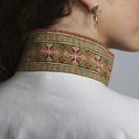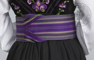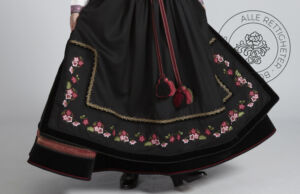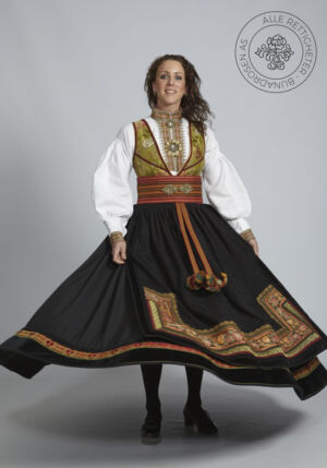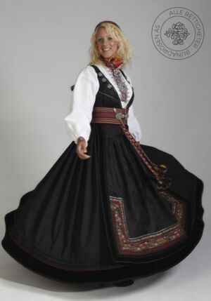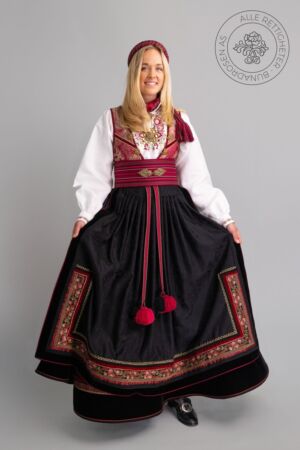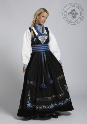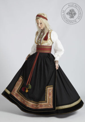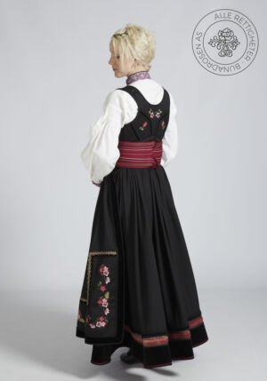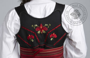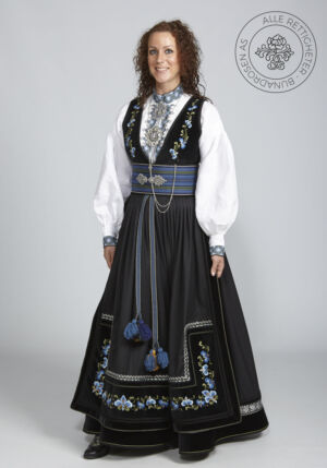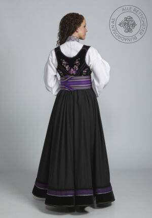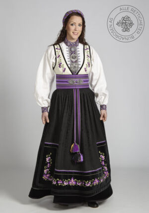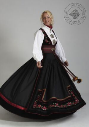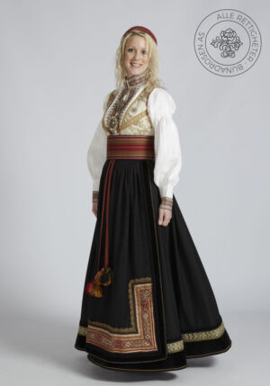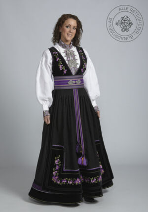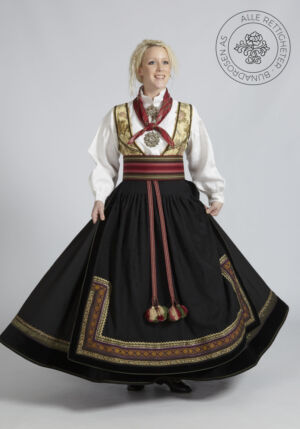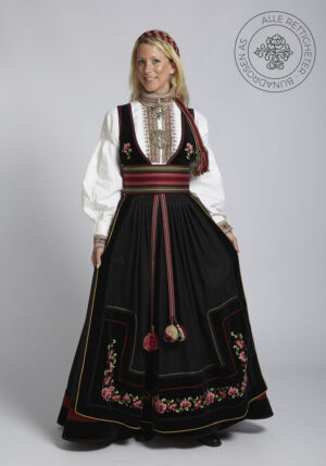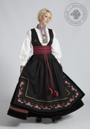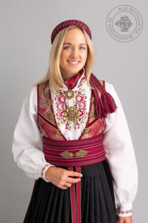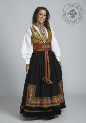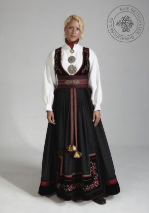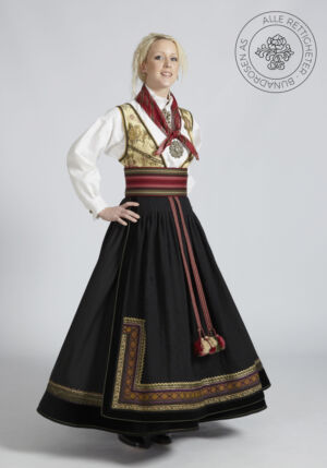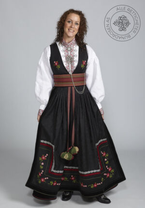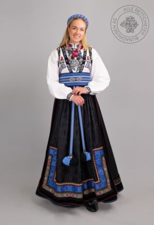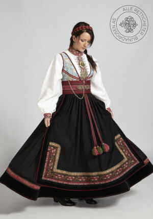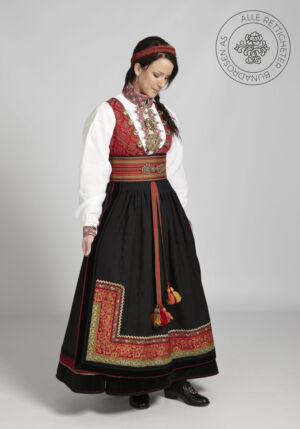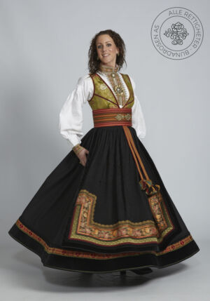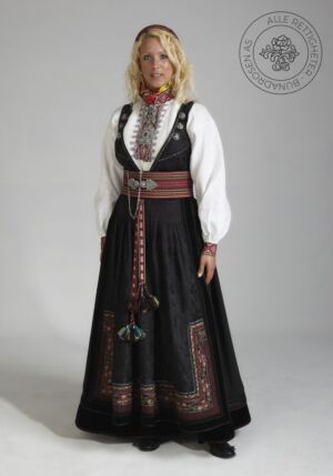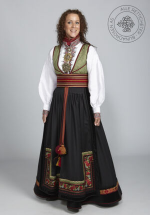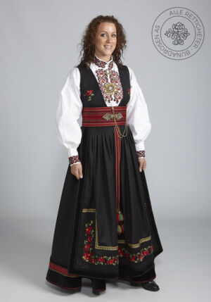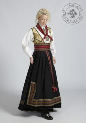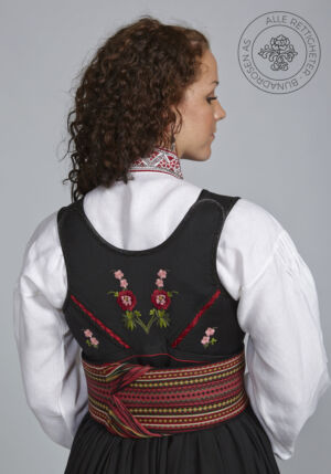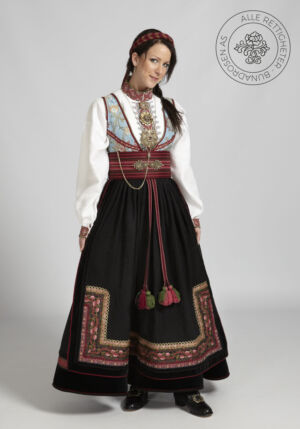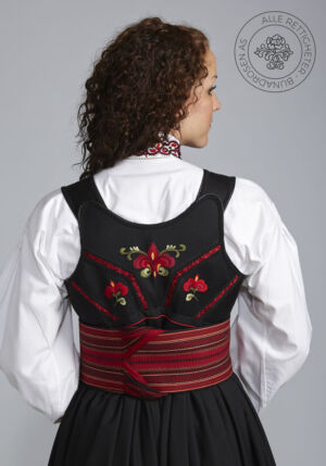 Som ytterplagg kan man bruke en jakke med broderier og pyntebånd, evt et brodert sjal. Jakken lukkes med en jakkespenne i sølv.