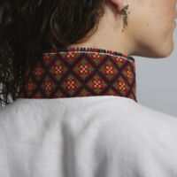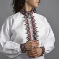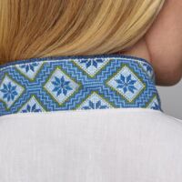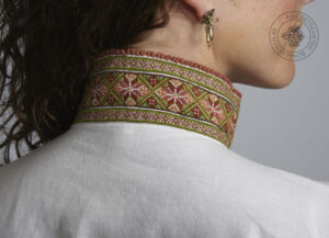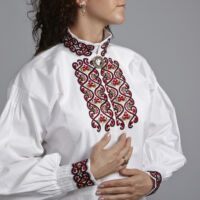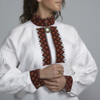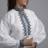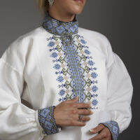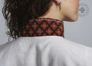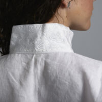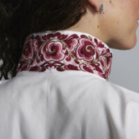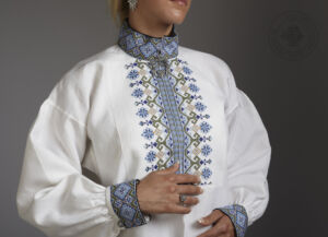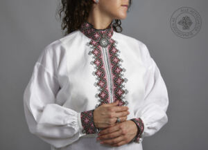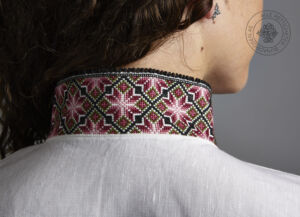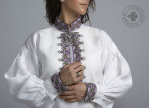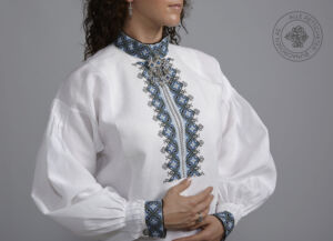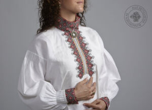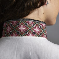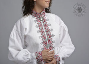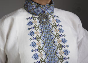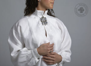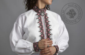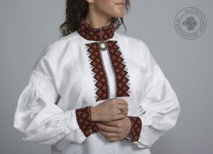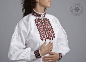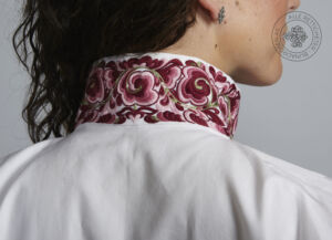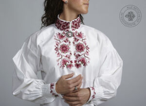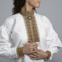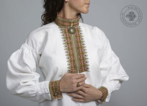 Skjorten er i lin eller bomull med broderier i plattsøm eller korssting på krage, mansjetter og på hver side av brystsplitten. Den lukkes med en halsring og mansjettknapper i sølv.