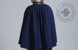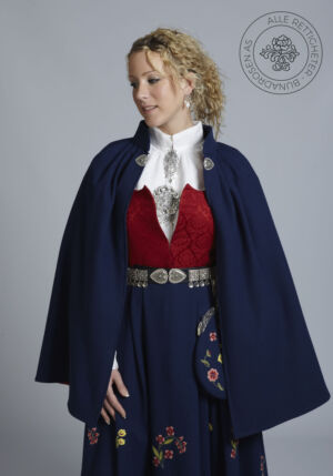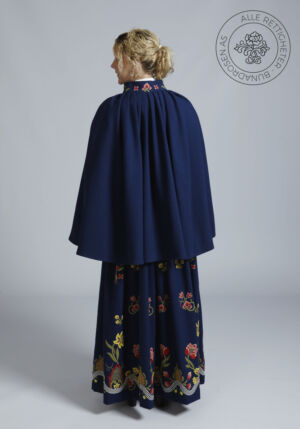 Capen sys i samme stoff som bunaden, med blått, rødt eller sort fór. Den er halvlang med ståkrage og broderi i nakken . Capen lukkes med en capehekte i sølv.