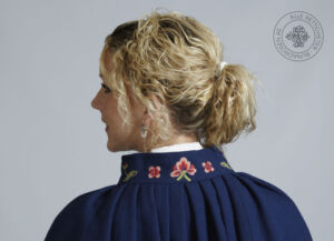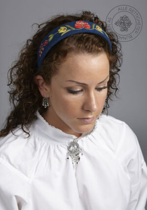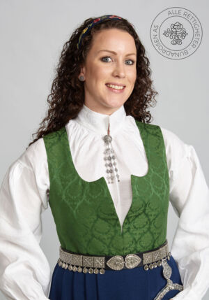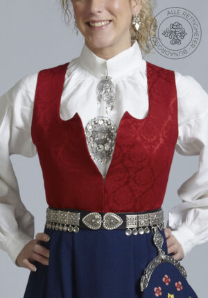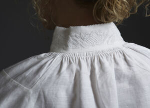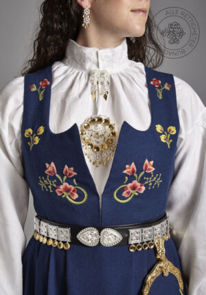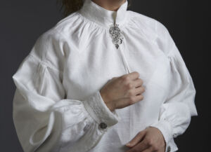Skjorten er i hvit lin med hvitsømsbroderier på krage og mansjetter. Alternativt kan man bruke en bomullskjorte med nuperellekant på krage og mansjetter. Skjorten lukkes med en halssølje og mansjettknapper i sølv.