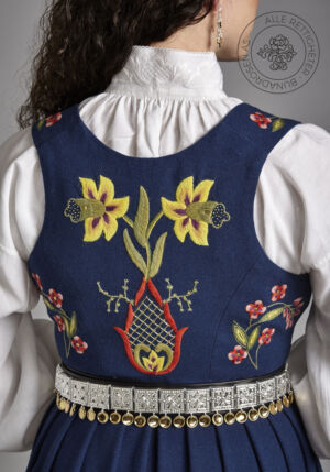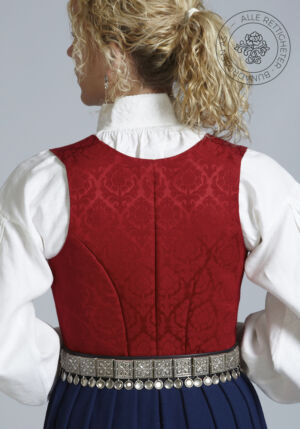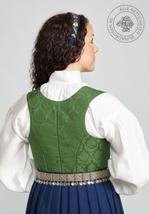Fra gammelt av ble det brukt blått eller sort ullstoff med flerfargede broderier, mens det fra 1952 også ble mulig å velge rødt eller grønt brokadestoff. Det har spilesøm bak i ryggen, og lukkes foran med skjulte hekter et stykke opp. Livet er sydd fast til stakken