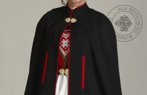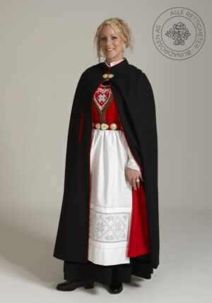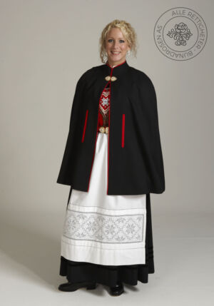 Capen er halvlang eller lang og sys i samme stoff som stakken. Den lukkes med en capespenne i sølv.