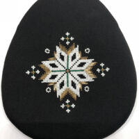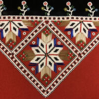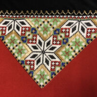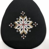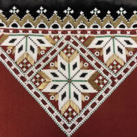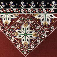Bringeduken er perlebrodert i mange forskjellige farger og kombinasjoner. Borenåler i sølv kan brukes for å feste bringeduken.