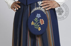 Vesken er i blå eller grønn klede med blomsterbroderi. Veskelåsen er i sølv eller plett.