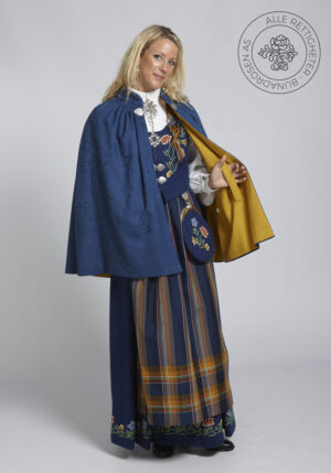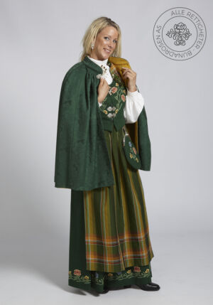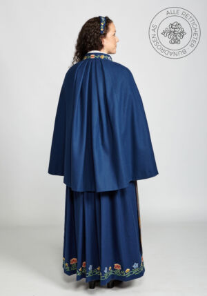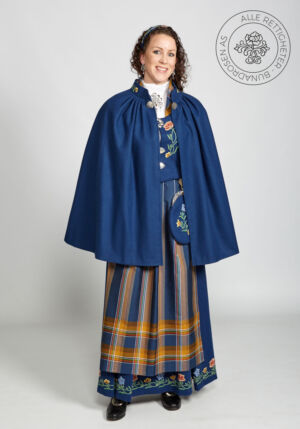 Capen er halvlang med ståkrage, og sys i mønstret ulldamask eller klede i fargene blått eller grønt. BunadRosen leverer capen i klede med broderi bak på kragen. Begge modellene lukkes med en capespenne i sølv.