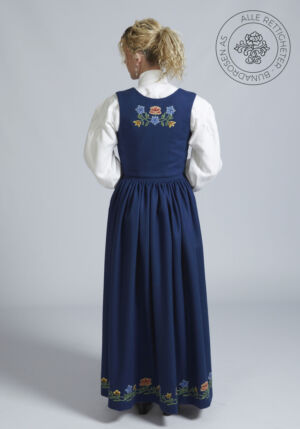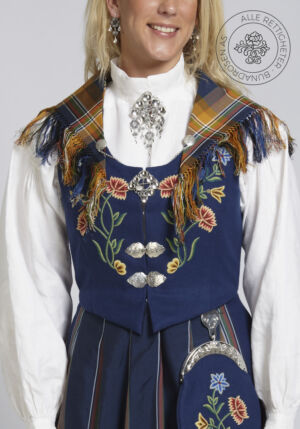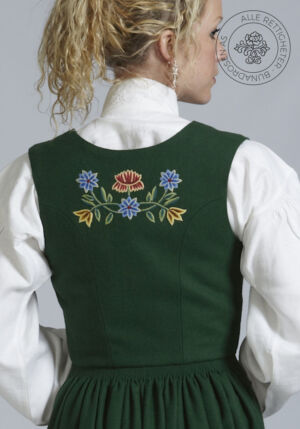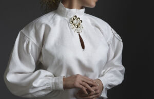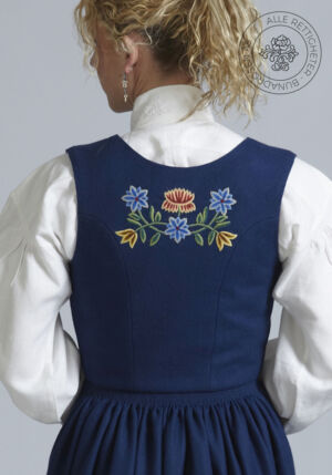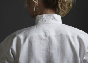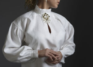 Skjorten er i hvit lin med hvitsømsbroderi på krage, mansjetter og langs halssplitten. Skjorten lukkes med en halssølje og mansjettknapper i sølv.