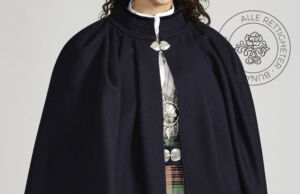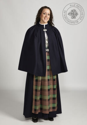 Capen sys i sort eller blå vadmel, og har ståkrage og er tett rynket til kragen. Den lukkes med en capespenne i sølv.