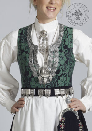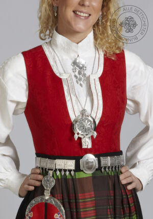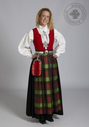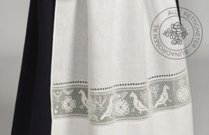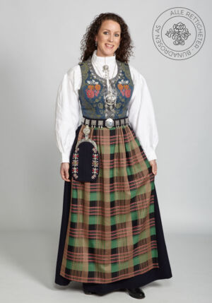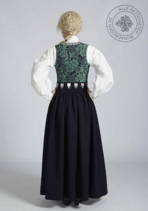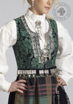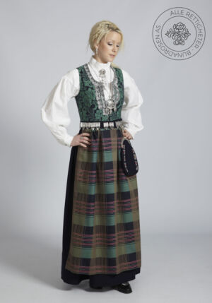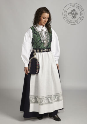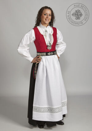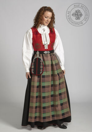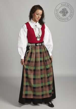Det brukes enten et rutete forkle i bomull og mohair som lages i både friske og duse farger, eller et hvitt, brodert forkle med enten geometrisk mønster eller fulgemønster i uttrekkssøm.
