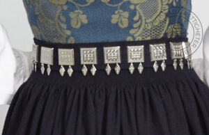 Det brukes et stoffbelte i sort eller blått toskafts ullstoff som lukkes med en beltespenne. Beltestølene og veskestølen sys fast på stoffbeltet for de som ønsker stølebelte.
