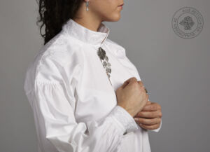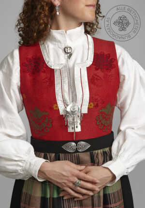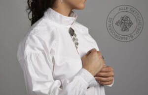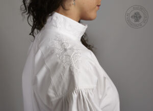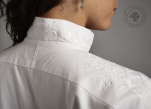 Skjorten er i hvit lin med broderier i «labbsaum» på krage, skulderstykker og mansjetter. «Labbsaum» er det lokale navnet på plattsøm. Skjorten lukkes med en sølje og mansjettknapper i sølv.