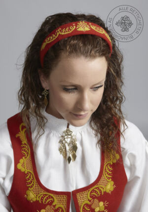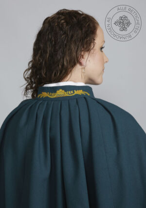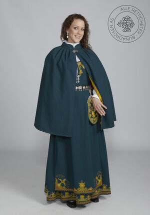 Det brukes cape med ståkrage sydd i samme stoff som bunaden, i tillegg til sort cape som anbefales å bruke til rød bunad, men som også kan benyttes til de andre bunadsfargene. Capen lukkes med en capehekte i sølv.