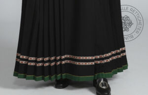 Stakken er plissert i sort toskafts ullstoff. Nederst er det påsydd en ullkant i samme grønne ullstoff som i livet. Over den grønne kanten er det sydd på 2 vevde bånd lik kantingen på livet. Stakken er sydd fast til livet.