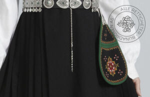 Det var opprinnelig ikke veske til bunaden, men i dag bruker man veske som er sydd i samme stoff som stakken, med broderi på framsiden. Veskekroken er i sølv.