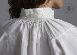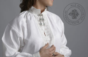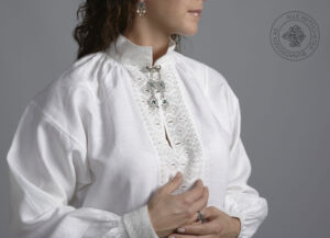 Det brukes hvit, brodert linskjorte med enkel uttrekkssøm, maurgang og stavtagger på krage, mansjetter og hver side av halssplitten. Skjorten lukkes med en sølje og mansjettknapper i sølv.