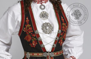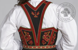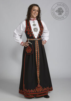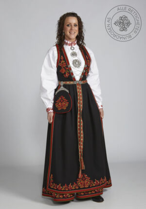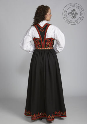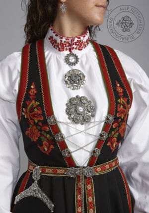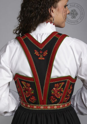 Jakken er i rødt ullstoff med sort, brodert kanting foran og nede på ermene. Jakkespenne i sølv for å lukke jakken, men dette er mest for pynt. Alternativt kan man bruke et ullsjal.