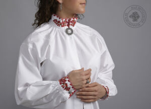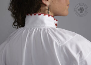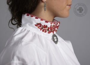 Skjorten er i lin eller bomull med hvite eller fargede broderier. Den lukkes med en halsring og mansjettknapper i sølv.