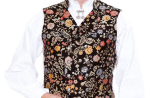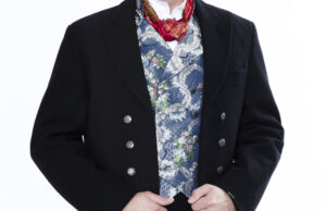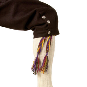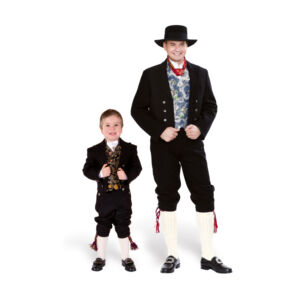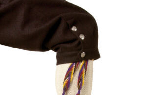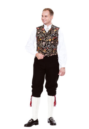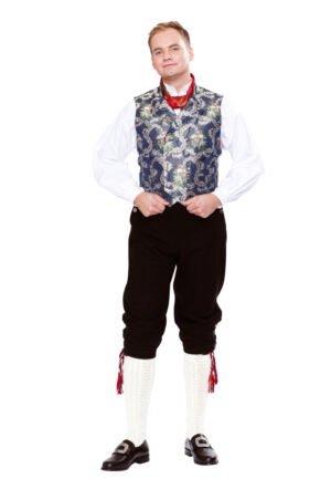Vesten sys i blå eller sort brokade, og har ståkrage og nedbrettede slag. Den er dobbeltspent og lukkes med 12 små sølvknapper.