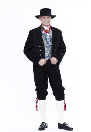 Det kan brukes en sort filthatt med flat pull som kan pyntes opp med et bånd med blomstermotiv, og et silketørkle som knytes utenpå skjortekragen i farger som matcher bunaden.