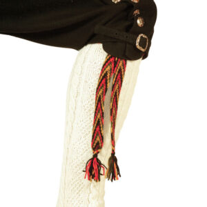 Håndstrikkede strømper i ubleket ullgarn som holdes opp av flerfargede hosebånd i farger som matcher bunaden. Sorte bunadsko med sølv- eller tinnspenne.