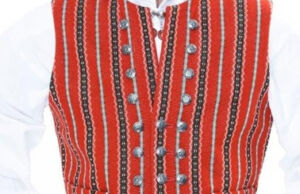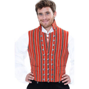 Vesten sys i stripete, rødt ullstoff med lyseblått, hvitt og mørkegrønt i rosebragdmønster. Den har ståkrage og høy halsskjæring. Vesten har tre knapperader med 28 små sølvknapper, men det er kun midterste rad som knappes.