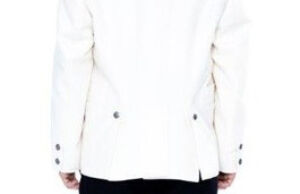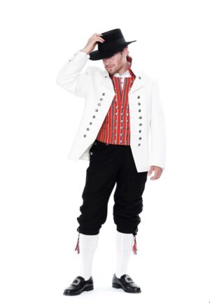 Jakken sys i hvit klede og har nedbrettede slag, ståkrage med pyntestikninger og skjøter bak i ryggen. Den er dobbeltspent og trenger 24 store sølvknapper.