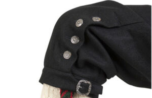 Nikkersen er i sort klede med en klaff foran, og knesplitt med linning ved hvert kne. Den trenger 25 store sølvknapper og knespenner i sølv.