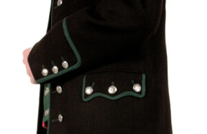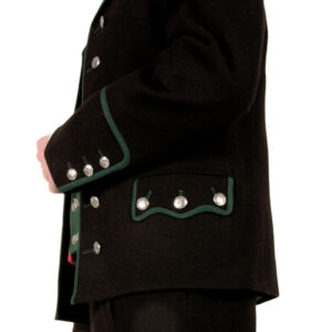 Jakken sys i sort klede og er en såkalt «stuttatrøye» som rekker omtrent ned til hoftene. Den har ståkrage og er kantet med grønt på lommeklaffer, slag og ermesplitter. I tillegg har den påsydd et grønt bånd et stykke opp på ermene. Jakken er dobbeltspent med 18 store og 6 små sølvknapper, men skal aldri lukkes.