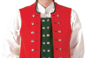 Vesten sys i rød klede med ståkrage. Foran er det felt inn et stykke grønt klede for å gi en illusjon av to vester, noe som var vanlig i tradisjonell bruk. Vesten er dobbeltspent med 16 små sølvknapper på det røde stoffet, og 16 små sølvknapper på det grønne stoffet.