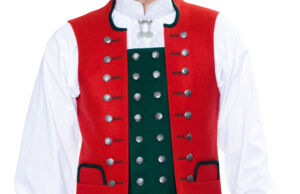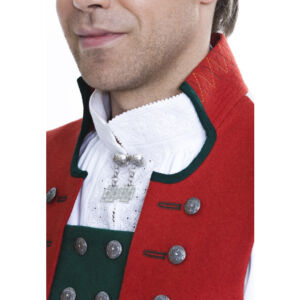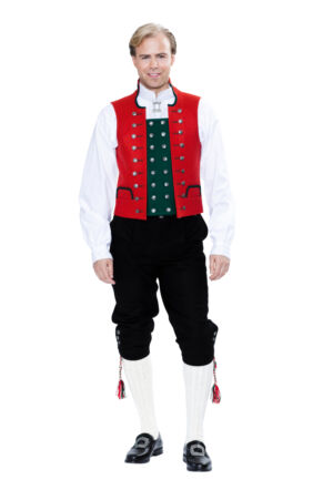 Det brukes halsknapp, mansjettknapper og små og store knapper. Kniv og lommeur med sølvkjede er også fint tilbehør. Sølvet er oksidert, og kan kjøpes hos BunadRosen.