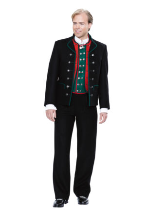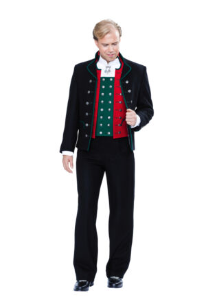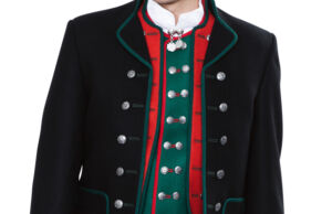 Jakken sys i sort klede og er en såkalt «stuttatrøye» som rekker omtrent ned til hoftene. Den har ståkrage og er kantet med grønt på lommeklaffer, slag og ermesplitter. Jakken er dobbeltspent med 12 store og 4 små sølvknapper, men skal aldri lukkes.