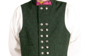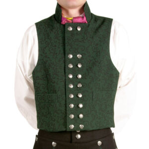 Vesten har rødbrun eller grønn bunnfarge med sort, påtrykket mønster. Den er dobbeltspent og lukkes med 20 små knapper i messing eller sølv.