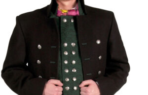 Jakken er en kort modell som sys i sort klede. Den har ståkrage og rødbrune eller grønne knapphull avhengig av fargen på vesten. Jakken skal aldri lukkes, men trenger 16 store knapper i messing eller sølv.