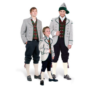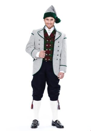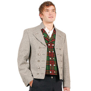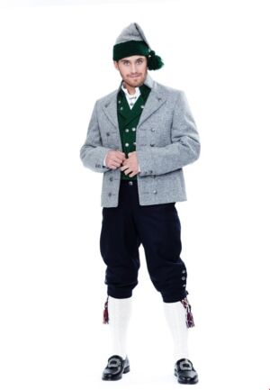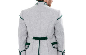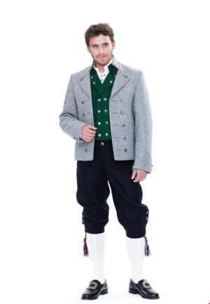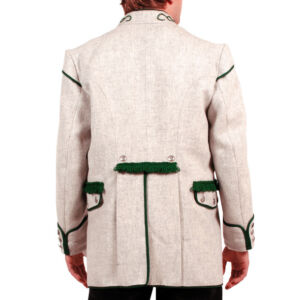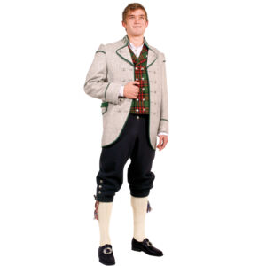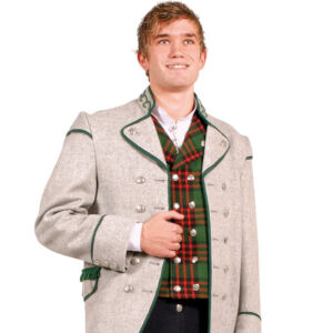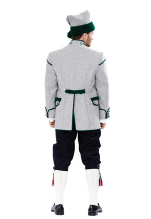 Det er to forskjellige jakker, begge sys i gråmelert vadmel. Kort jakke har ståkrage og nedbrettede slag. Lang jakke er kantet med grønne ullbånd og har nedbrettede slag og ståkrage med grønn, brodert bord. På lommeklaffene og bak på ryggen over skjøtene er det en grønn frynsekant. Begge jakkene er dobbeltspent og det trengs 12 store og 4 små sølvknapper til kort jakke, og 20 store og 6 små sølvknapper til lang jakke.