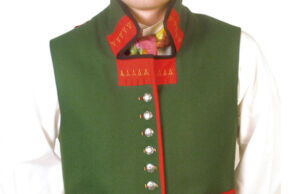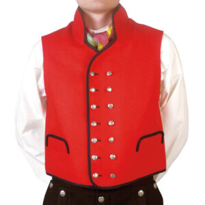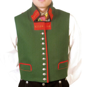 Til hvit jakke brukes rød vest i klede med sort kanting og ståkrage. Til rød jakke brukes grønn vest i klede med grønn kanting og ståkrage. I fremkant på kragen og øverst på vesten i front er det rødt ullstoff med gult broderi. Rød vest er dobbeltspent, og lukkes med 14 små sølvknapper, mens grønn vest er enkeltspent og lukkes med 10 små sølvknapper.