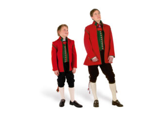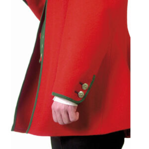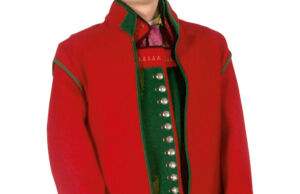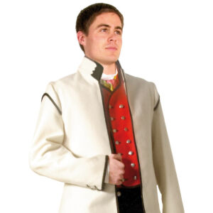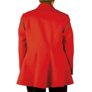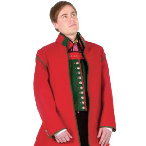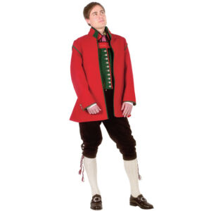 Jakken er lang, og sys i naturfarget eller rød vadmel med ståkrage med applikasjoner og stikninger, isydde kiler i ryggen og ermebryninger. Hvit jakke kantes med sorte ullbånd, mens rød jakke kantes med grønne ullbånd. Ved splitten nederst på ermene skal det sys på totalt 4 store sølvknapper.