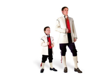 Det brukes små og store knapper, halsknapp, mansjettknapper og knespenner. Kniv og lommeur med sølvkjede er også fint tilbehør. Sølvet er oksidert, og kan kjøpes hos BunadRosen.