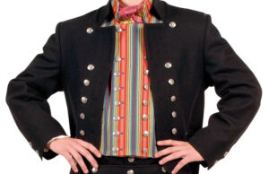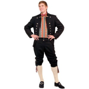 Jakken sys i sort eller mørkeblå klede eller vadmel og har ståkrage med sorte stikninger og skjøter bak i ryggen. Den er dobbeltspent og trenger 24 store sølvknapper.