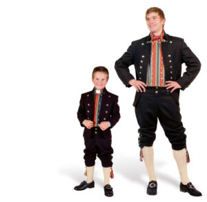 Det brukes små og store knapper, halsknapp, mansjettknapper og knespenner. Kniv og lommeur med sølvkjede er også fint tilbehør. Sølvet er oksidert og kan kjøpes hos BunadRosen.