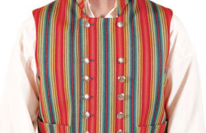Vesten sys i stripete ullstoff med ståkrage og høy halsskjæring. Den er dobbeltspent og lukkes med 16 små sølvknapper.