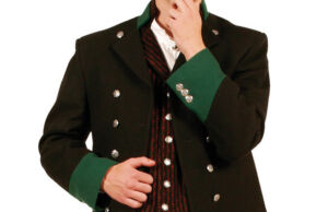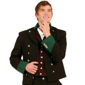 Jakken sys i sort klede med nedbrettede slag og grønn ståkrage. Nederste del av ermene er også dekorert med grønne mansjetter og splitt med 6 små sølvknapper. Jakken er dobbeltspent med 12 store sølvknapper, men skal ikke lukkes.