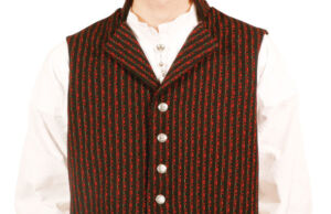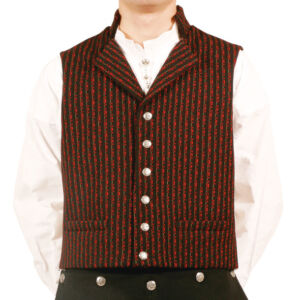 Vesten er i sort ullstoff med striper i rødt og grønt, hvor rødt er den dominerende fargen. Den har ståkrage og nedbrettede slag, og lukkes med 6 små sølvknapper.