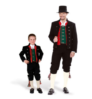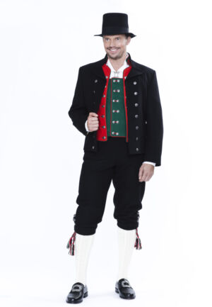 Det brukes halsknapp, mansjettknapper og små og store knapper. Kniv og lommeur med sølvkjede er også fint tilbehør. Sølvet er oksidert, og kan kjøpes hos BunadRosen.