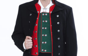 Jakken sys i sort klede og har ståkrage med sorte stikninger og nedbrettede slag. Den er dobbeltspent med 20 store sølvknapper, men skal aldri lukkes.