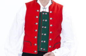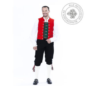 Vesten sys i rød klede og har ståkrage med stikninger. Foran er det felt inn et stykke grønt klede for å gi en illusjon av to vester, noe som var vanlig på Voss på 1800-tallet. Kragen, lommene og de røde fremstykkene er kantet med grønt ullstoff, mens det grønne midtpartiet er kantet med rødt. Vesten er dobbeltspent med 14 store sølvknapper på det røde stoffet, og 12 små sølvknapper på det grønne stoffet.